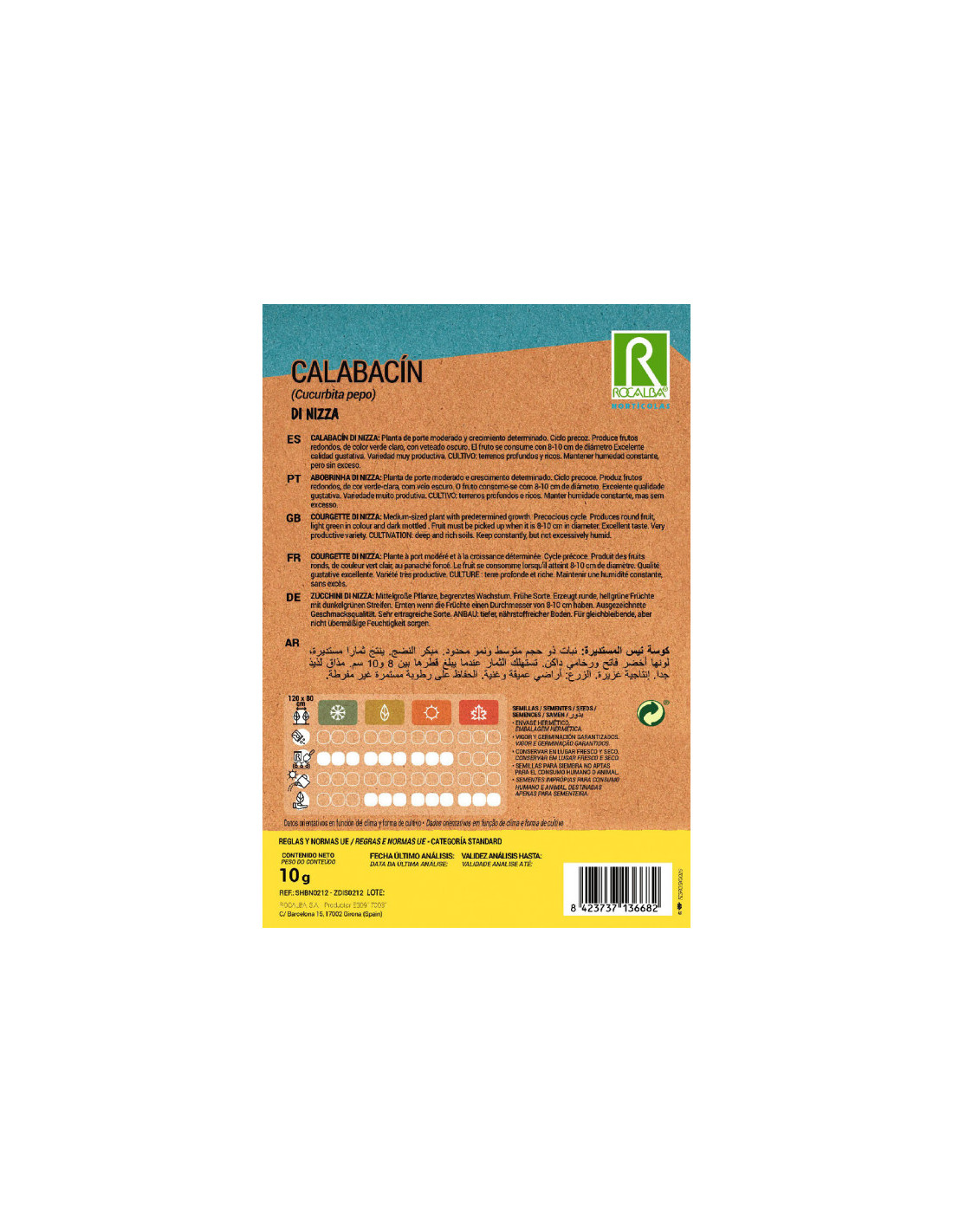 Planta de porte moderado y crecimiento determinado. Ciclo precoz. Produce frutos redondos, de color verde claro, con veteado oscuro. El fruto se consume con 8-10 cm de diámetro Excelente calidad gustativa. Variedad muy productiva.
